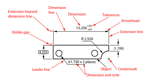 Dimensions provide the necessary information for the size and shape of the object being drawn. They include: